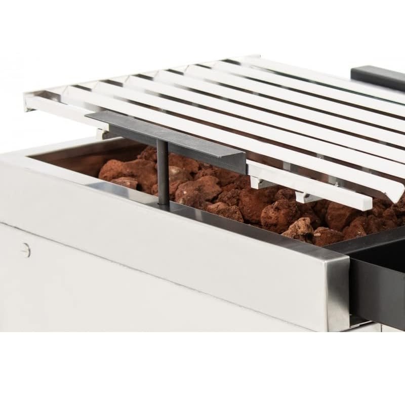 Barbecue à gaz avec grille nervurée avec finition inox, disposition en pierre volcanique.
