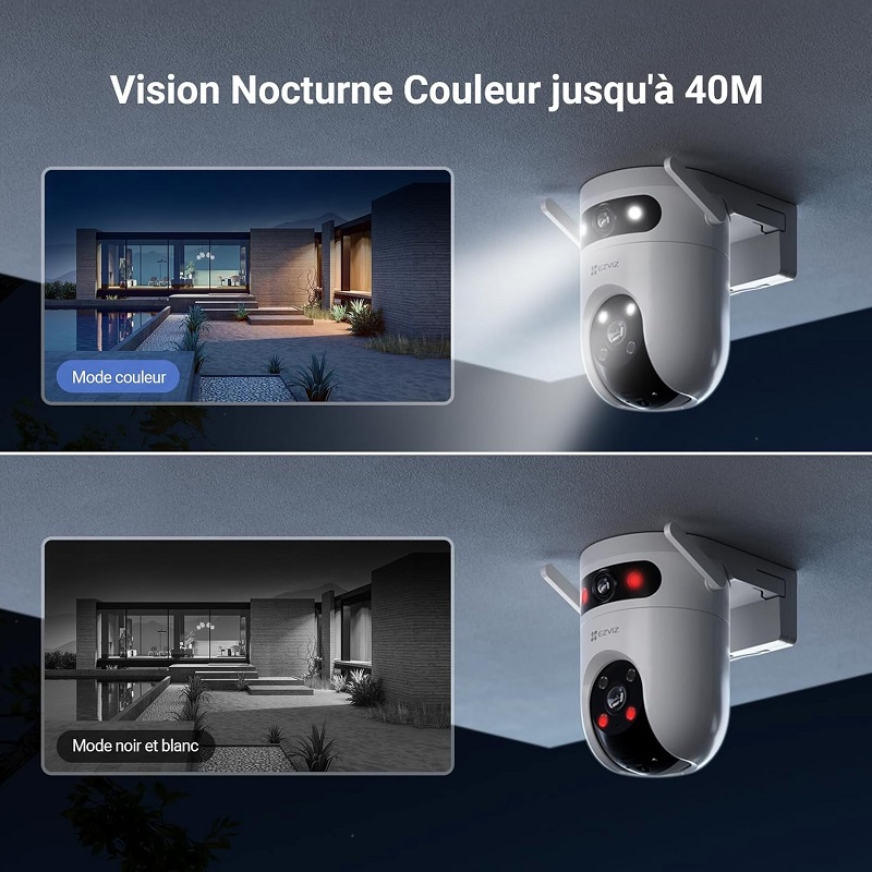 Equipée d'une vision nocturne couleur exceptionnelle, elle est renforcée par 4 projecteurs intégrés pour des images nettes même dans l'obscurité totale. Elle propose trois modes de vision nocturne pour répondre à tous les besoins : le mode couleur pour une clarté maximale, le mode intelligent qui bascule automatiquement en noir et blanc lors de la détection de mouvements, et le mode noir et blanc pour une visibilité accrue dans des conditions de faible luminosité. Avec une portée de vision nocturne atteignant 40 mètres, cette caméra assure une surveillance efficace à toute heure du jour et de la nuit.