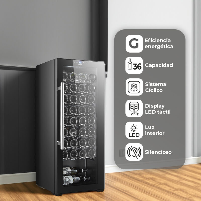 Cave à vin à refroidissement cyclique, moteur universel et fluide frigorigène R600a. Classe énergétique G et niveau sonore maximal de 41 dB. Design noir avec une porte vitrée unique non réversible et poignée. Zone de température unique. Commandes tactiles avec affichage LED et éclairage intérieur LED. Capacité totale de 106 litres ou 36 bouteilles, avec plusieurs compartiments pour un rangement optimal.