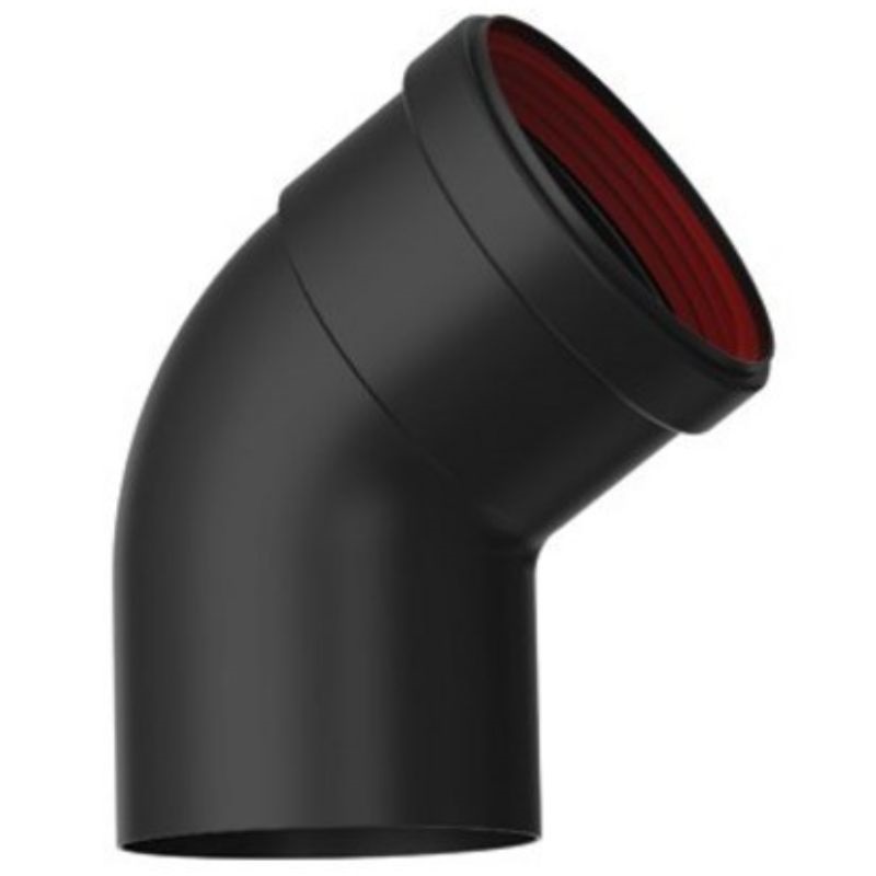 Coude simple M-H à 45° de 80 mm de diamètre en acier inoxydable vitrifié, pour conduits de poêles à granulés, en aluminium extrudé injecté, avec joints en silicone. Épaisseur de paroi minimale du conduit : 1 mm. Température maximale : 200 °C. Voir figure : coude 80° 45°.