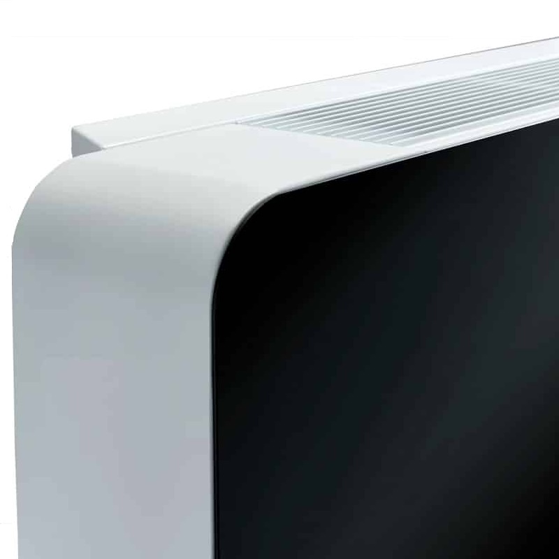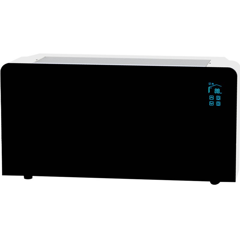 Déshumidificateur mural de marque TRAU, modèle DHC100-NR. Design élégant et fonctionnel, façade en verre tactile blanc. Batterie d'évaporateur et de condenseur avec traitement époxy pour environnement piscine, démarrage automatique (redémarrage uniquement en cas de coupure de courant) Ventilateur DC à 3 vitesses sélectionnables.