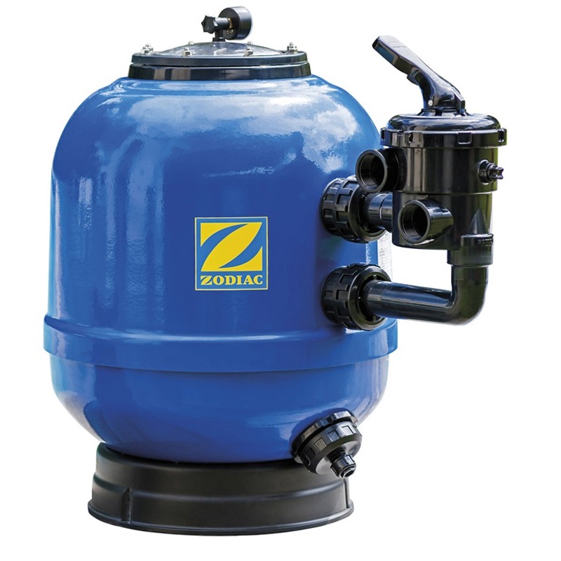Filtre en polyester renforcé de fibres de verre avec ailette latérale à 6 voies, couvercle transparent, manomètre et vidange. Comprend un système de drainage pour le filtre.
