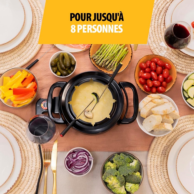 L'appareil à fondue Tristar peut préparer le dîner et le dessert, vous pouvez utiliser le service à fondue pour la traditionnelle fondue savoyarde ou bourguignonne, opter pour une fondue un peu exotique, comme la fondue au bouillon (chinoise) ou plutôt pour une fondue sucrée et onctueuse au chocolat, grâce à sa puissance de 1 000 W, le caquelon atteint la température souhaitée rapidement.