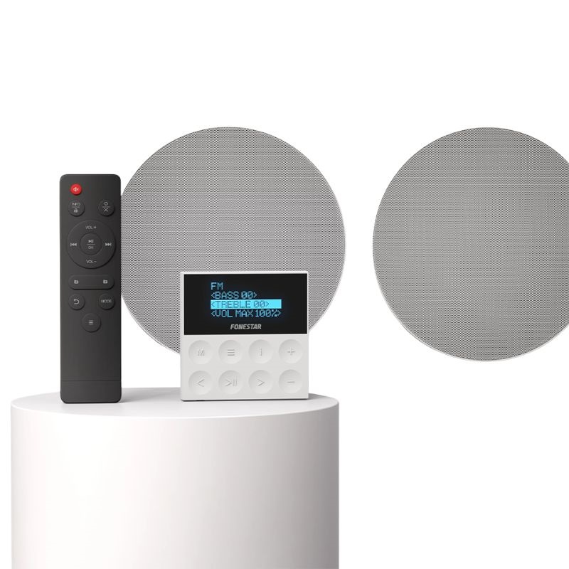 Ce kit s'installe dans des boîtiers universels carrés et ronds standard, s'intégrant ainsi facilement à tous les espaces. Il se contrôle via des boutons tactiles ou la télécommande fournie. Idéal pour les petits systèmes audio dans les salles d'attente, les petits commerces, les maisons, etc.