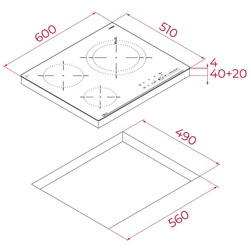 Grâce à ses dimensions standard, cette plaque de cuisson s'installe facilement. Avec une largeur de 600 mm, une profondeur de 510 mm et une hauteur de 64 mm, elle s'adapte parfaitement à la plupart des plans de travail standards. Son système de fixation intuitif réduit le temps d'installation et facilite son intégration dans la cuisine.