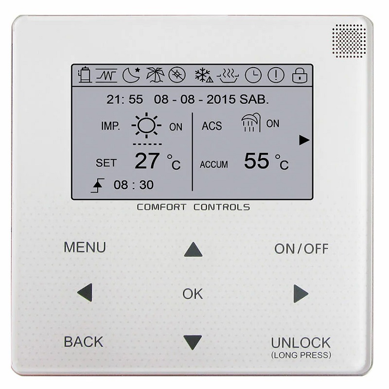 Le système de contrôle global supervise toutes les fonctions du système d'onduleur et garantit le bon fonctionnement du compresseur. Il intègre des algorithmes de contrôle utilisant des courbes de température prédéfinies et sélectionnables par l'utilisateur, la gestion d'un circuit sanitaire, la programmation de plages horaires pour la réduction du bruit nocturne, l'affichage des alarmes, la prévention du blocage de la pompe et l'intégration de générateurs de chaleur externes. Veuillez noter qu'un raccordement au réseau électrique triphasé (3~/400 V) est nécessaire au fonctionnement et que l'autorisation du gestionnaire de réseau est requise avant la première installation. Seul le gestionnaire de réseau ou une entreprise d'installation agréée par ce dernier peut installer l'appareil.