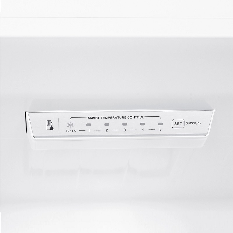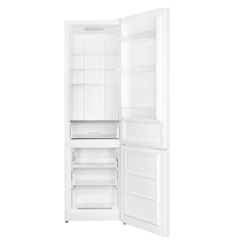 Design blanc avec 2 portes réversibles à ouverture par simple pression. Éclairage intérieur LED. Système de contrôle électronique, dégivrage automatique et fonctions pour une utilisation optimale du réfrigérateur.