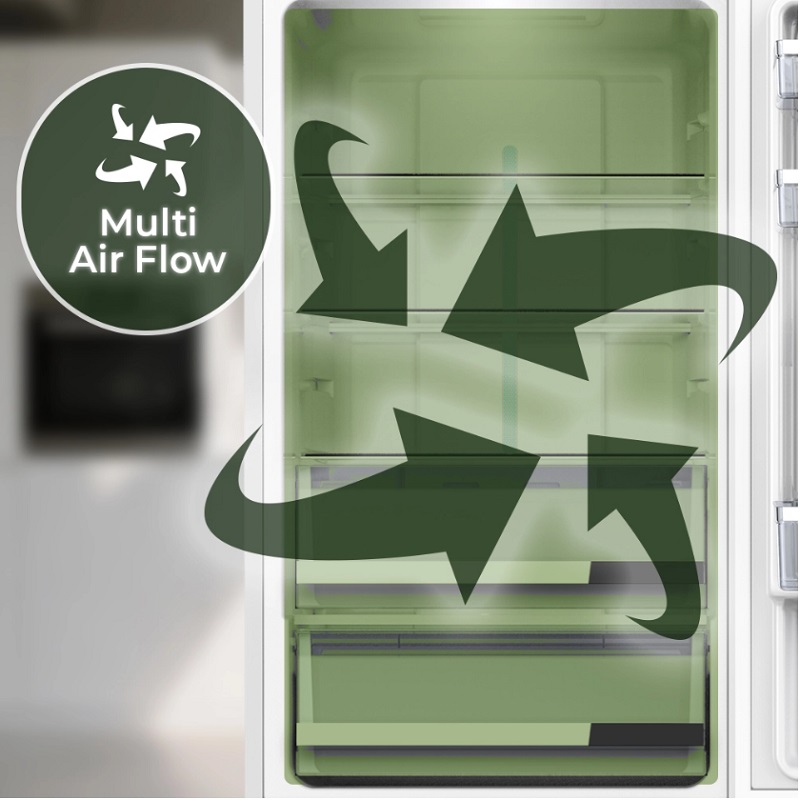 La technologie No Frost assure une conservation optimale des aliments et empêche la formation de givre et de glace dans le réfrigérateur. Associée à la ventilation Multi Air Flow, elle garantit une répartition homogène de l’air dans toute la cavité et un refroidissement plus rapide.