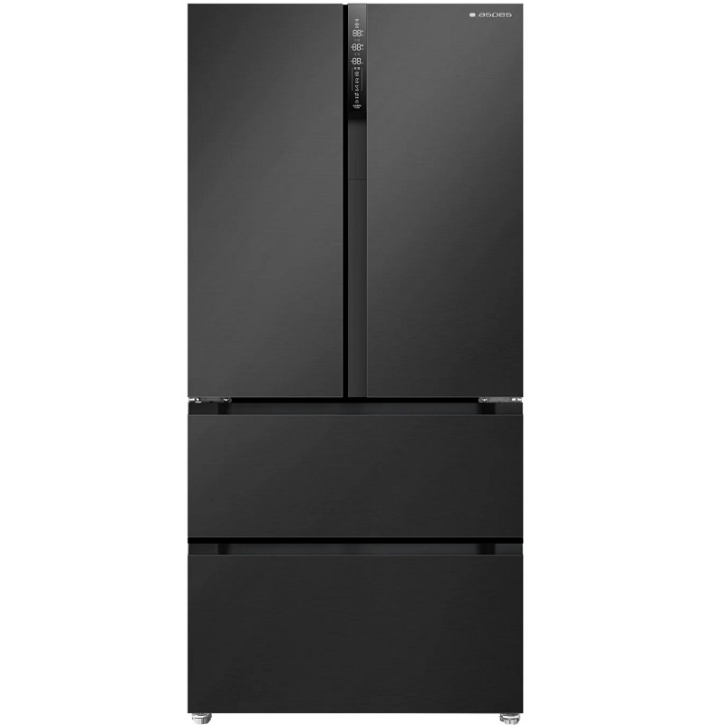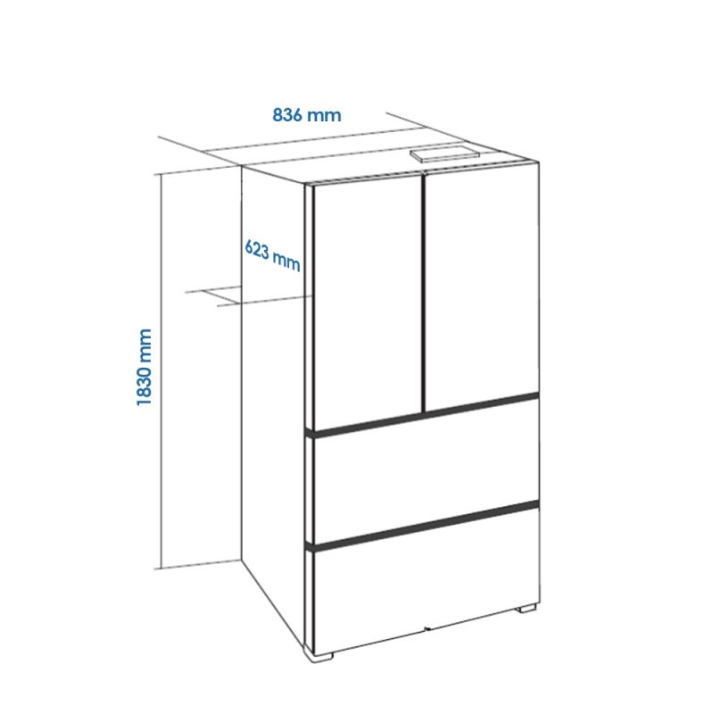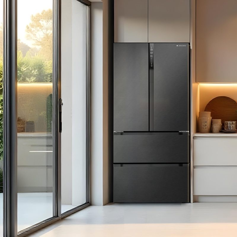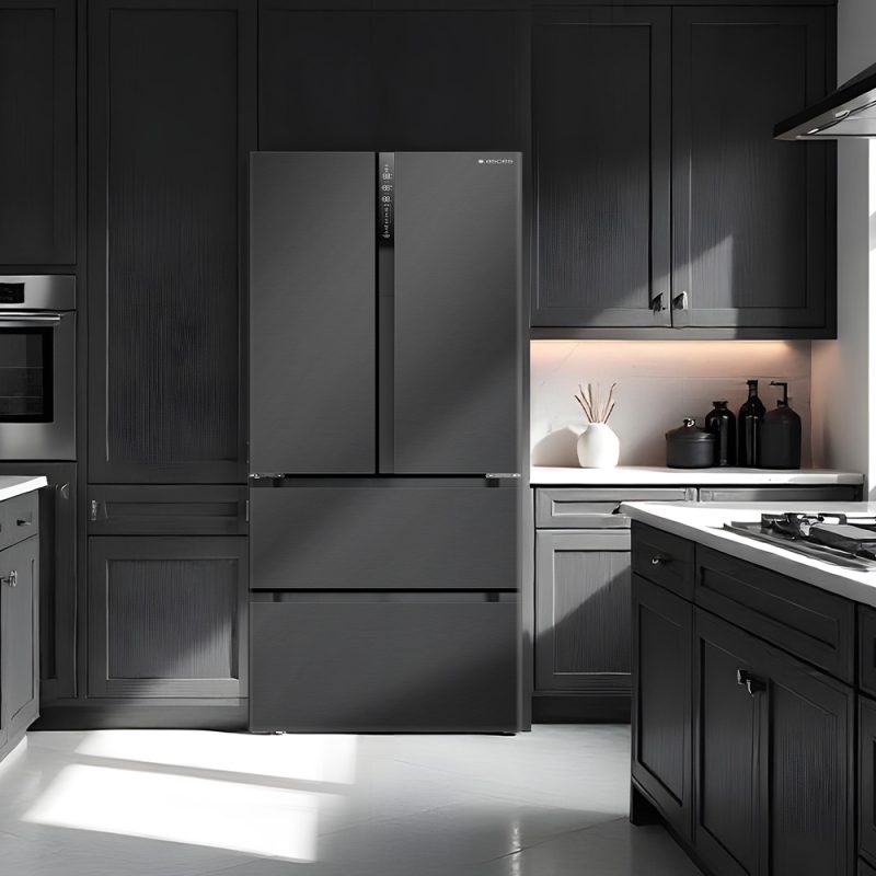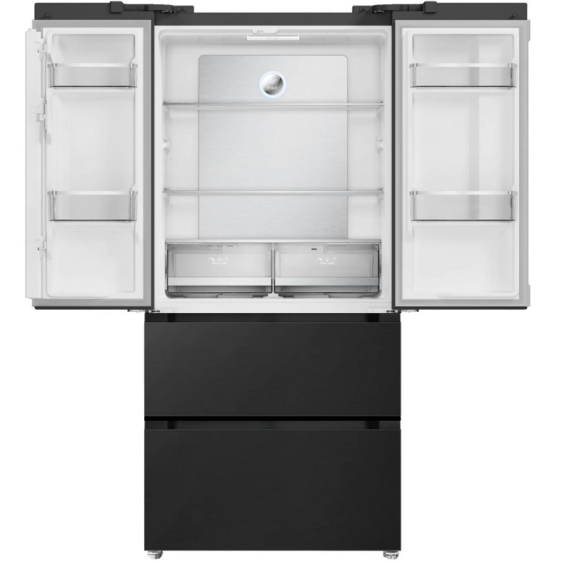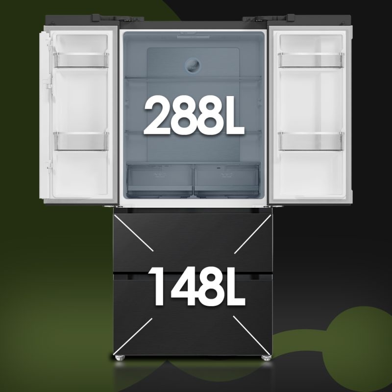 Finition inox foncé avec quatre portes non réversibles à ouverture par simple pression et système d'espace libre à 90°. Éclairage intérieur LED. Système de commandes tactiles avec affichage LED, dégivrage automatique et fonctions optimisant les performances du réfrigérateur. Capacité totale de 436 litres, avec un congélateur 4 étoiles et de multiples compartiments pour un rangement optimal.