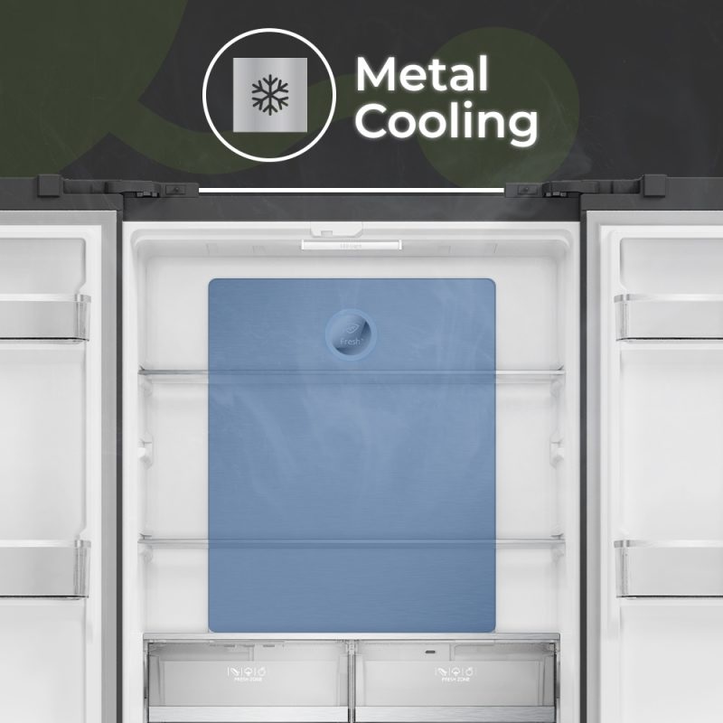 Le revêtement intérieur Metal Cooling maintient une température de refroidissement optimale et assure un refroidissement durable. Grâce à l'excellente conductivité thermique du métal, la feuille métallique conserve le froid plus longtemps, même en cas d'ouvertures et de fermetures fréquentes de la porte, en limitant les variations de température. Le système d'ouverture Zero Clearance permet de placer le réfrigérateur dans n'importe quel espace. Il permet aux portes de s'ouvrir efficacement à 90°, sans nécessiter d'espace latéral.