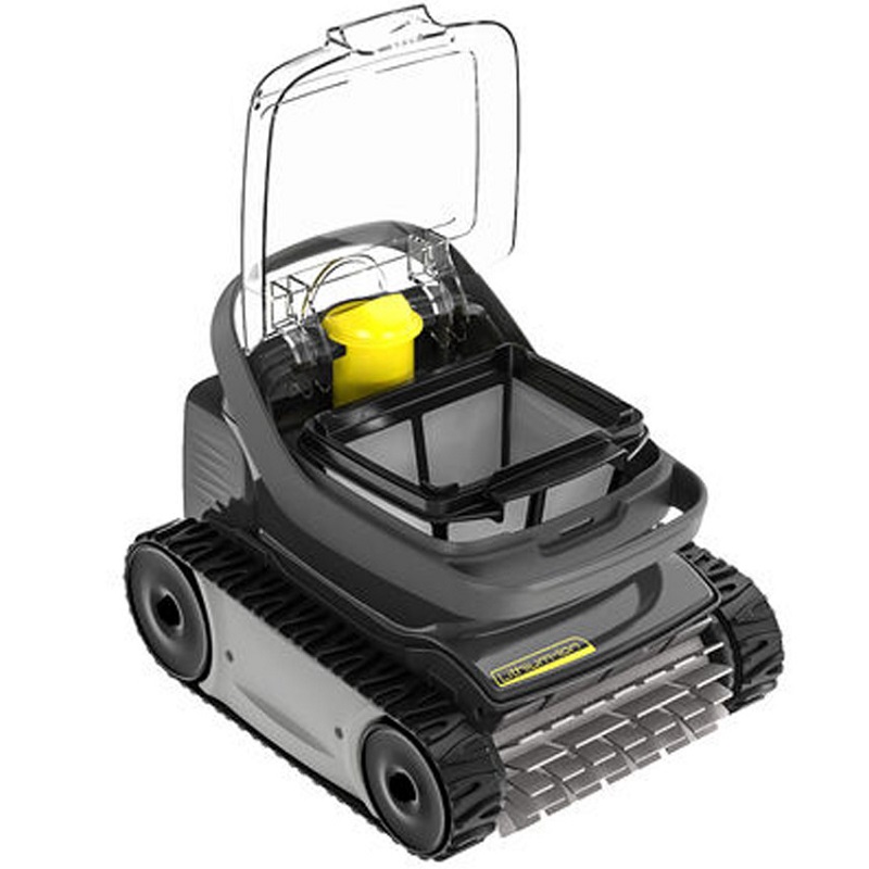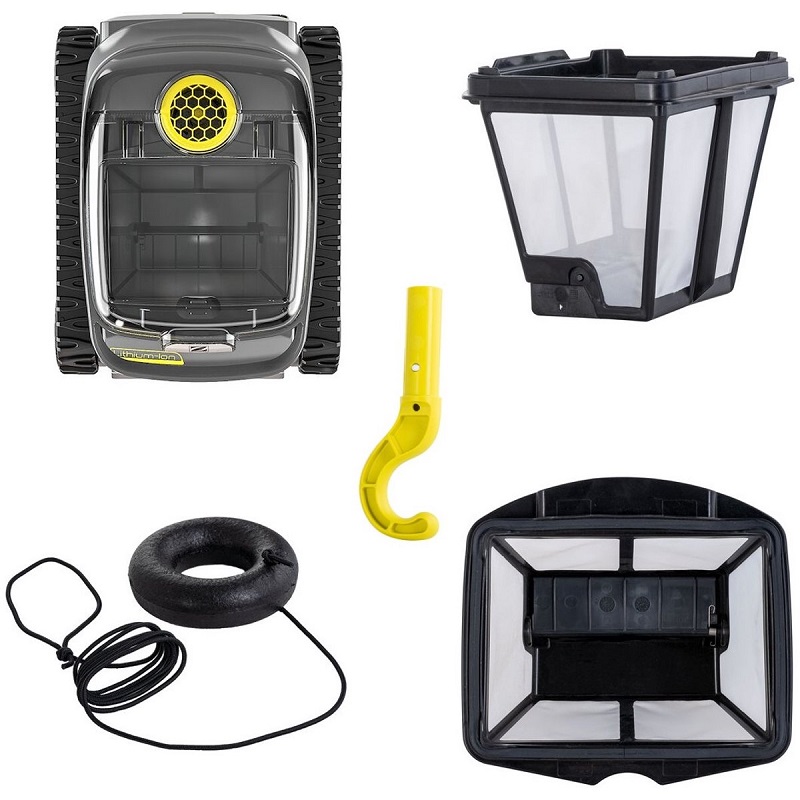 Grâce à la fenêtre transparente, vous pouvez vérifier immédiatement la quantité de saleté dans le filtre. Le filtre est facilement accessible par le haut du robot. Cela rend le nettoyage du filtre très facile. Une fois le cycle de nettoyage terminé, le robot s'arrête à côté d'une paroi de piscine afin de pouvoir le sortir facilement de l'eau. Au fil du temps, le robot coulera au fond et pourra ensuite être facilement retiré de l'eau à l'aide du crochet fourni.