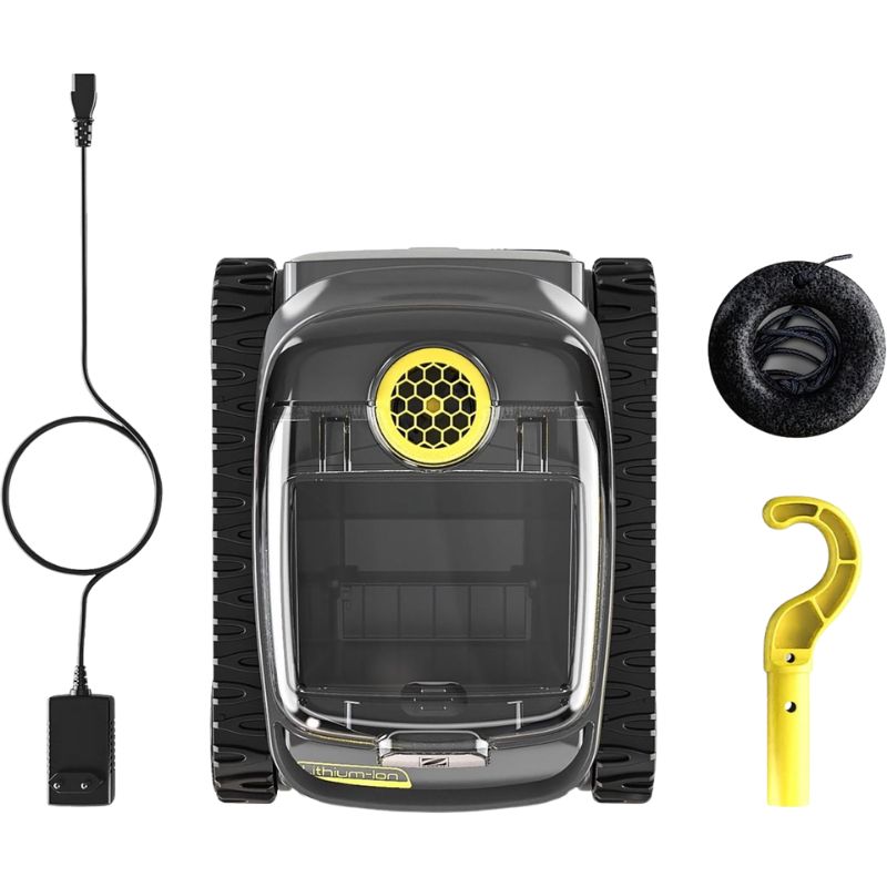 Le robot OP32, sera fourni avec un chargeur, un filtre simple ainsi que le crochet universel pour faciliter le robot à la sortie de l'eau. Un robot sans fil électrique doté d’une batterie lithium-ion permet un nettoyage autonome de votre piscine sans besoin de le brancher au système de filtration ou à une prise électrique. Il brosse et récupère les débris dans son propre bac filtrant