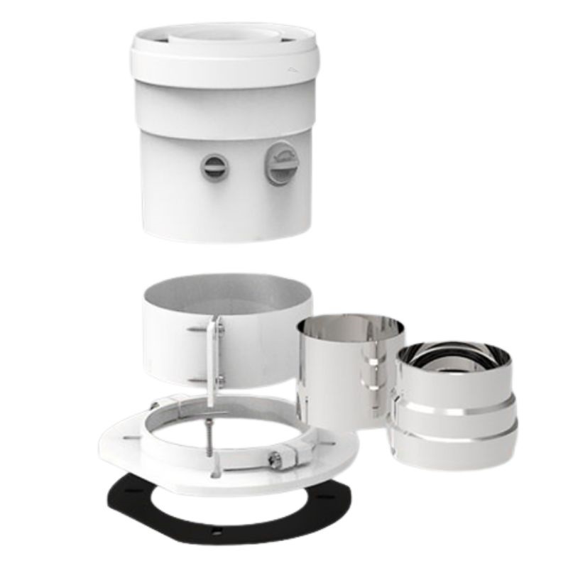 Raccordement vertical coaxial de conduit de fumée (Ø60/Ø100) avec orifice d'échantillonnage en aluminium et aluminium laqué compatible avec les chaudiéres gaz, avec faibles émissions de NOx / Étanchéité à l'air. Aluminium / PVC