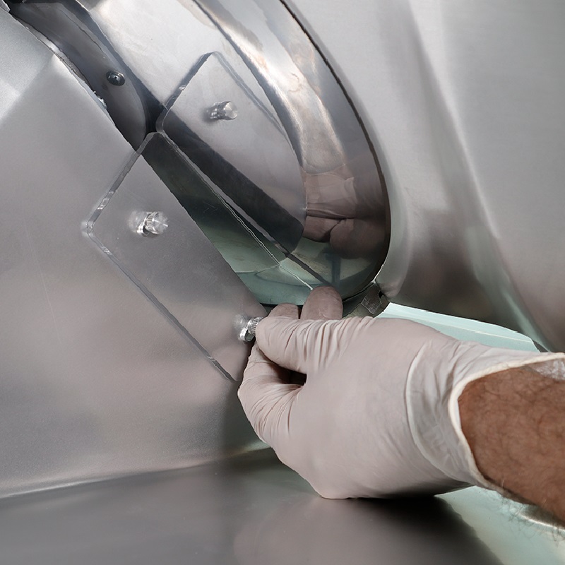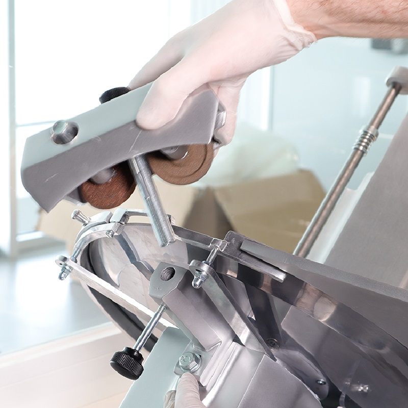 Toutes les trancheuses sont dotées d'un anneau de protection fixe qui protège le tranchant de la lame, assurant une sécurité optimale lors du nettoyage et de l'entretien. Des protège-mains en plastique transparent sont également inclus. Protection inférieure. Le chariot est monté sur des bagues autolubrifiantes assurant un glissement fluide, facilitant ainsi la découpe de charcuterie, fromages, rôtis, etc.