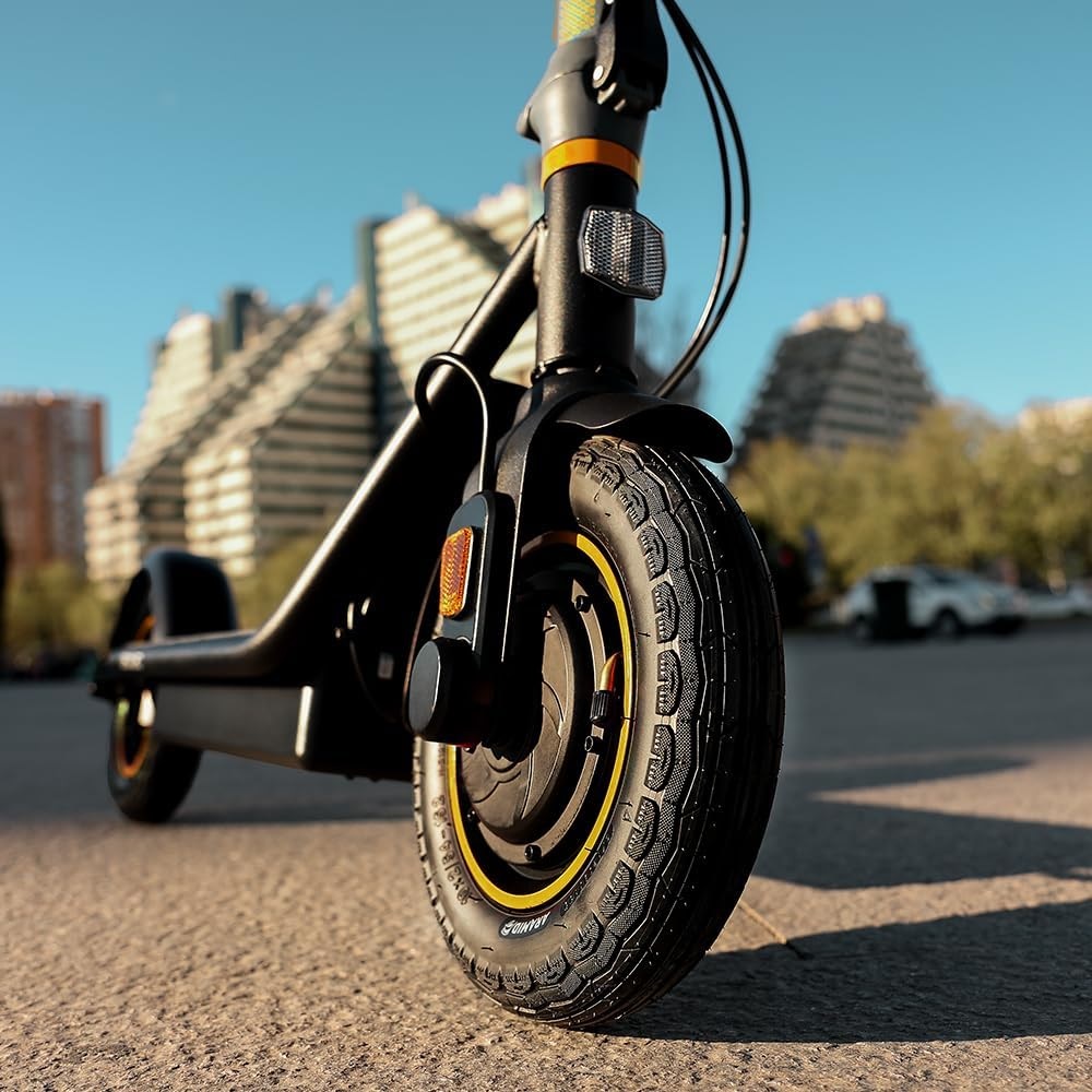 Grande adhérence, pneus gonflables de 10 pouces pour vous déplacer en ville avec une adhérence maximale et en tout confort, double freinage, sécurité garantie, frein avant électrique et frein à disque arrière pour plus de sécurité à chaque trajet.
