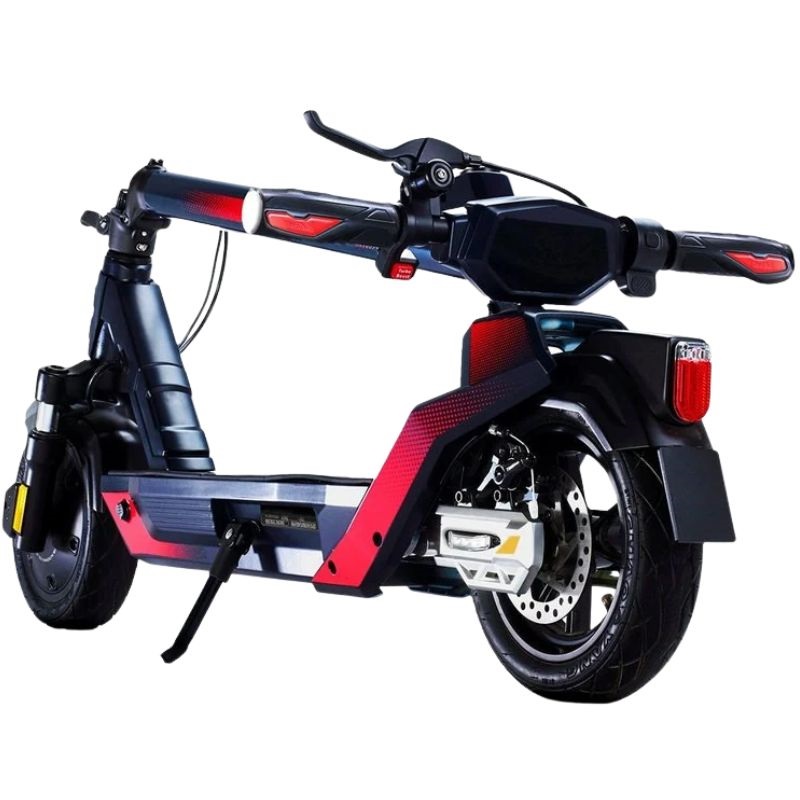 Il se distingue aussi par son design en couleurs noir et rouge, associé à l’identité de la marque, et sa structure pliable facilitant le rangement et le transport dans des espaces réduits ou en transports en commun, augmentant ainsi son confort et sa praticité au quotidien. Le trottinette intègre des roues de 10 pouces à l’avant comme à l’arrière, assurant une bonne stabilité et une capacité d’absorption des irrégularités du terrain urbain. De plus, il dispose d’un écran intégré permettant à l’utilisateur de suivre clairement des informations clés telles que la vitesse ou la charge restante de la batterie durant chaque trajet.