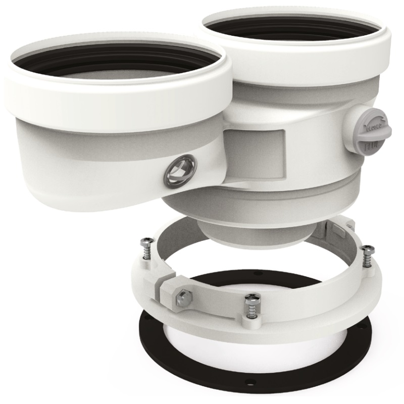 Adaptateur coaxial pour sortie de chaudière à double flux, compatible avec les chaudières Biasi, Cointra, Fagor, Ferroli, Manauld, Remeha, Sime et Tifell, en polypropylène avec joints.