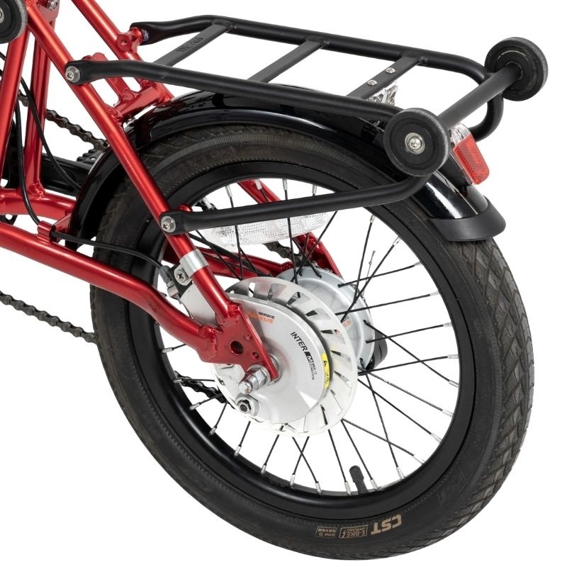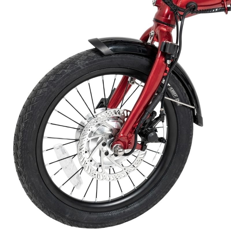 Ses roues avant et arrière mesurent 16 pouces, des dimensions offrant un bon équilibre entre maniabilité et stabilité, idéales pour circuler sur routes et chemins pavés. Le vélo permet une distance maximale par charge allant jusqu’à 45 km, ce qui le rend adapté aux trajets quotidiens sans recharges fréquentes, favorisant un usage durable et économique. De plus, il est conçu pour être compatible avec les prises standard européennes (Prise EU), facilitant sa recharge dans tout logement ou lieu public équipé.